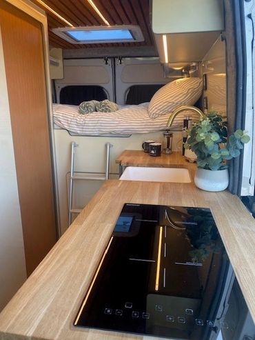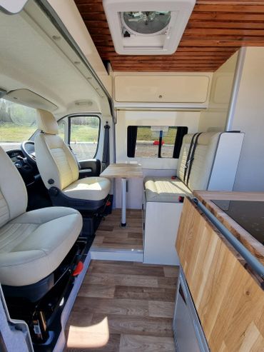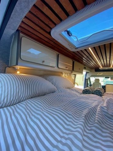 Jennifer Vaniston is our newest van and perfect for that luxury, van-life experience. She is a manual Citroen Relay, sleeps 2/3 people and comes with fixed bed with mattress & bedding, fridge, diesel heater, WIFI, toilet, Apple Car Play, twin induction hob, lithium battery with inverter and TV. This van has manual transmission.